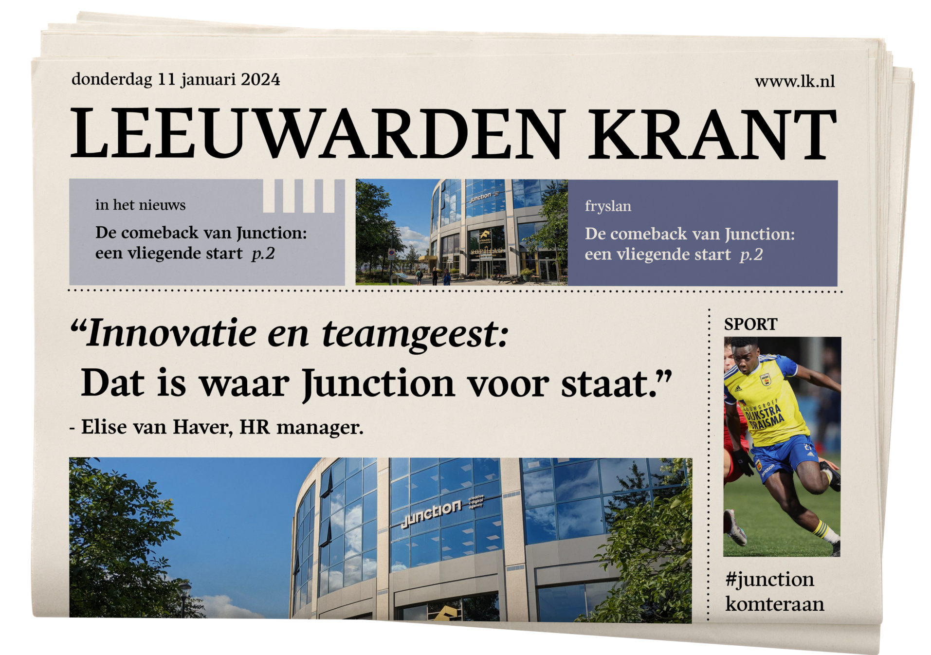 Goed. Het is dus tijd om de boel eens flink op te schudden. Te bewijzen dat we niet alleen door mogen maar vooral ook willen. Want we hebben een tik gehad, dat ontkennen we niet. We pakken dit moment. Laten zien wat we bedoelen met ‘impact maken’ en hoe we dat ook voor jouw merk creëren. Daarom zetten we onszelf toepasselijk ondersteboven, doen het anders. Van onze gevel tot de website, door de straten van ‘t noorden tot in je eigen huiskamer. We kunnen het niet duidelijk genoeg benadrukken: Junction is alive and kicking.